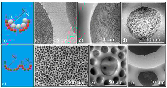 In the present article we show how such a superstructure, namely an ordered hemispherical concavity array, can be obtained by using large-size polystyrene micrometric spheres as scaffolds for the self-assembly of small-size silica sub-micron spheres (Figure 1i). To use spheres of two different sizes for their self-assembly is a normality for an already mature scientific domain, namely Binary Colloidal Crystals [57,58,59]. However, in this domain, the limits for the spheres’ size ratio r that is defined as the ratio between small size spheres and large size spheres varies between 0.4 and 0.1. These limits allow a rich structuration of the colloidal crystal films in the x-y plane parallel to the substrate, but even when the smallest is used, namely 0.1, the spheres are not able to form a structured film in the z directions. This can be realized for much smaller ratios. In our case the ratio is 0.005, a few orders of magnitude lower, which allowed the obtaining of a quality colloidal crystal array structured in all three directions. Moreover, three-dimensional patterned colloidal crystals having as structural units ordered concavities (rather than simple colloidal crystals) as units can be constructed. This could be a new level of patterning.
