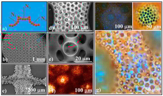 Superstructures can be integrated into higher complexity superstructures on larger size scales of hundreds of micrometers by using a polyester fabric [34], where polystyrene spheres of tens of micrometers can be forced to follow the pattern of the fabric and to self-assemble on a large area (Figure 7b,c). After infiltration of the silica spheres and the removal of the polystyrene spheres by calcination, higher complexity superstructures (such as those in Figure 7d) composed only of silica spheres are obtained. If instead of calcination (T > 350 °C), the polystyrene/silica grid is only heated to 250 °C for PS melting and infiltration between silica spheres, followed by silica dissolution by HF solution, an inverse opal-like higher complexity superstructure is obtained (Figure 7e). These polystyrene high complexity superstructures appear red in transmission light-optical microscopy (Figure 7f) and have a complex way of reflecting and diffracting white light (Figure 7g). UV-Vis spectrometry (not shown) present the same band gaps structure as that from the Figure 5i inset.