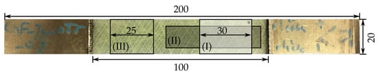 In accordance with the UD tensile tests, the laminates were equipped with aluminium end tabs as well. The specimens were cut to their final dimensions using a high-precision abrasive cutting machine, and the edges were not polished after cutting. An image of a representative specimen used for matrix cracking analysis with its final dimensions is shown in Figure 1 for a laminate specimen. The bonding yarns are clearly visible and the areas used for (I) cracking analysis, (II) thermographic imaging, and (III) strain measurement at the front side of the specimen are indicated.
