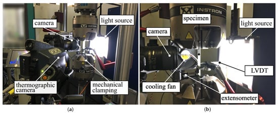The crack counting experiments were conducted on an Instron 8801 servo-hydraulic testing machine equipped with a 100 load cell and mechanical wedge grips. The static experiments were carried out in terms of displacement control, whereas the fatigue experiments were performed by means of load control. An extensometer with a gauge length of was used to determine the applied strains. Additionally, a thermographic camera was used to monitor possible specimen heating throughout the experiments for selected specimens exhibiting high stress amplitudes. The measurements revealed a maximum temperature increase of when the cooling fan was in use. For the case of compressive stresses within a load cycle, a linear variable differential transformer (LVDT) was mounted perpendicular to the specimen surface to monitor possible specimen bending.