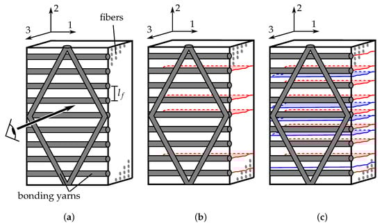 Schematic representation of the cracking process in a single layer of a given laminate: (a) the bonding yarns are adhesively attached on top of the UD-ply (), (b) first crack initiation (red) covered by bonding yarns, and (c) subsequent initiation of additional cracks (blue) in the latter course of the experiment growing between bonding yarns, which are clearly visible. The direction of observation is parallel to the 3-direction.