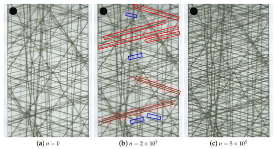 Considering the fatigue experiments, the tests were automatically paused ten times within every decade of load cycles in order to take the images. The specimens were not unmounted from the testing machine and the experiments were continued automatically after the image was taken. In accordance with static testing, an initial image was taken before any cyclic loading was applied. Consequently, a set of 41 images per fatigue test was analyzed by the proposed detection method. To determine the crack density, , within the layer in every k-th image, the sum of the crack lengths was normalized by the area of observation in terms of