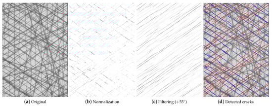 (a) Original image of a cracked specimen after loading cycles and results of the proposed image processing technique after (b) normalization and (c) Gabor filtering perpendicular to the -direction. Detected cracks within the −55° (blue) and +55° layers (red) are plotted together with the original image in (d).