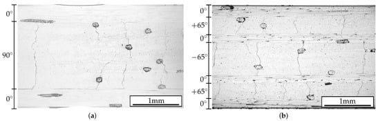 Edge micrographs of (a) and (b) laminate after fatigue testing for loading cycles. The dark cylindrical and elliptical areas represent bonding yarns. In (a), delaminations occurred during testing at the layer interfaces, emanating from the tips of the transverse matrix cracks.