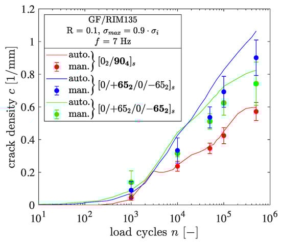In a second step, the cracks within two different laminates were counted manually from the normalized images to further check the accuracy of the algorithm. Therefore, five normalized intensity images, , for two specimens with different fiber orientations were analyzed manually. The moments of observation were chosen to be spread along the whole number of cycles in order to check the algorithm’s accuracy for a wide range of crack densities. The comparison between the results obtained by manual and automated crack counting is provided in Figure 7. In the case of the laminate, the results are provided in terms of the thin +65° and thick −65° layers, respectively.