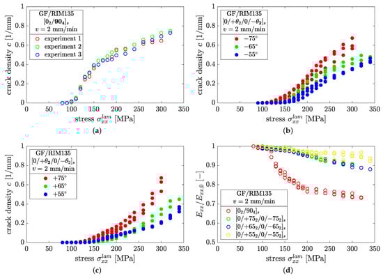 The detrimental effect of additional shear stresses on the initiation and growth of cracks can be seen from Figure 12c, and has been found by previous authors as well [,,]. In axial loading, shear stresses arise with decreasing fiber angle and cause pronounced crack growth for otherwise similar normal ply stresses of ; plies exhibit the highest shear stresses. Interestingly, this is in contrast to the cracking behavior under static loading conditions, where low fiber angles delay crack initiation and generate a lower number of cracks prior to specimen failure (cf. Figure 8b,c).