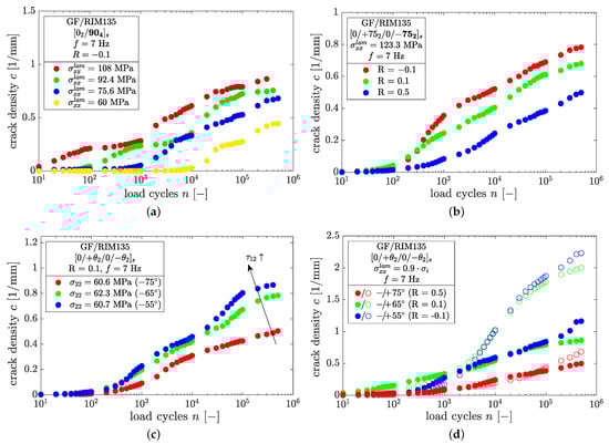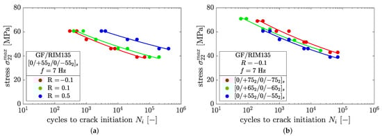 Following Carraro et al. [] the fatigue behavior can be characterized by crack initiation and crack evolution. The cycles of crack initiation are shown in Figure 9 in terms of the maximum normal ply stress , where the circles represent experimental data and the lines refer to a power law relation of type . Regarding the case of the laminate in Figure 9a, the results show that lower stress ratios lead to earlier crack initiation, which can be attributed to higher stress amplitudes. The trend of earlier crack initiation for decreasing stress ratios was consistently found for all fiber orientations.