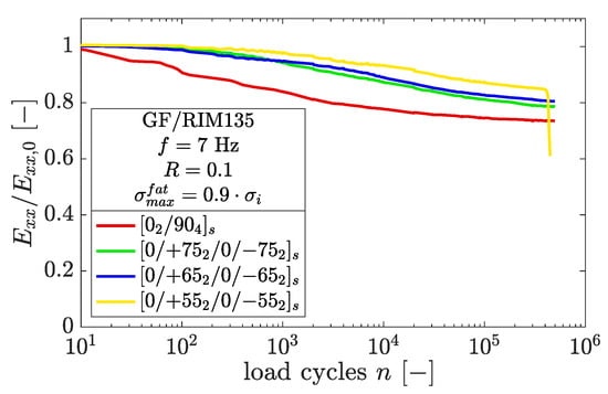 The highest stiffness loss was measured in the case of 90° off-axis layers, whereas the lowest stiffness loss was found for the specimen. The latter failed after n = 452,062 load cycles due to widespread delamination and subsequent ply splitting of the 0° layer. All other specimens represented in Figure 10 showed delamination growth, which was most pronounced in the case of the specimen. The delaminations mainly began growing from the specimen edges, and always in the presence of a microcrack.