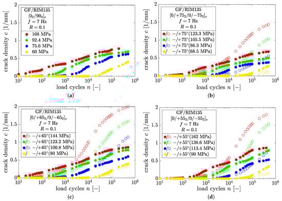 In Figure 11a–d, the results of the crack counting procedure in thin and thick plies as well as the dependence on the fiber orientation are shown for the load ratio . The results of all the experiments at and can be found in Appendix A.