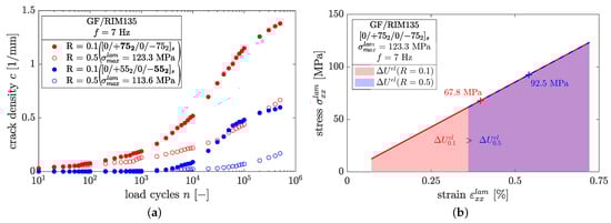 In both cases, specimens having a load ratio of show less cracks than the corresponding specimens at . It is therefore reasonable to assume that crack growth under fatigue loading is driven by amplitude rather than maximum loads. This can be clarified by considering the range of the elastic strain energy, , stored within the laminate throughout cyclic loading. The stress–strain relationship of a laminate comprised of layers at the beginning of a fatigue test is depicted in Figure 13b. For simplicity and because of the low stress levels applied in fatigue loading, the stress–strain relationship is assumed to be linear. The strain energy is provided by the area under the stress–strain curve and the abscissa. Both specimens shown in Figure 13a were loaded with the same maximum stress and different load ratios. It is evident that the range of the strain energy, , which is related to the strain energy release rate according to , is smaller in case of compared to . Hence, pronounced crack growth should expected for . From the authors’ point of view, it is therefore reasonable to establish crack propagation laws in terms of the range of the total strain energy release rate, vs. . On the other hand, should not be considered as the driving force for crack growth due to its insensibility for, e.g., different load ratios in case of same maximum applied load. In such a case, the different crack density results in Figure 12b could not be explained.
