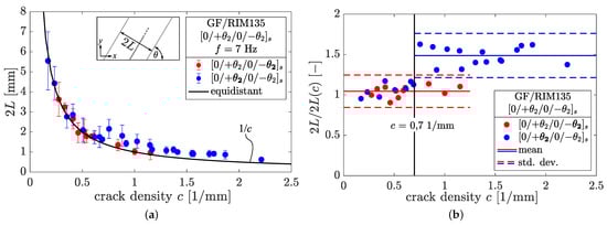 Therefore, the crack distance, 2 L, of two neighboring cracks next to a growing crack was measured for ten individual cracks from every image under consideration, with each image corresponding to a certain equidistant crack density. The results shown in Figure 14a were gathered from specimens with fiber angles of , , and for thick () and thin () layers, respectively. In total, six different specimens and 24 images taken over the whole range of loading cycles were analyzed. It was found that the measured crack spacings in the case of both thick and thin layers correspond very well with the equidistant crack spacing as long as holds true. Regarding crack densities of , the measured crack spacings within the thin layers deviate from their corresponding equidistant crack spacings. Subsequently, the crack spacings of the thin layers in which crack growth takes place were larger for increasing crack densities compared to their corresponding equidistant values. In contrast, thick layers show good agreement between the measured and equidistant crack spacings for crack densities up to . Higher crack densities were been observed in thick layers in any of the experiments.