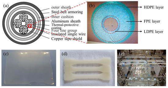 Low-density polyethylene (LDPE) pellets have a density of 0.925 g/cm3 and a melt index 0.4 g/10 min. Foamed polyethylene (FPE) pellets have a density of 0.948 g/cm3 and a melt index of 3.9 g/10 min. High-density polyethylene (HDPE) pellets have a density of 0.945 g/cm3 and a melt index of 0.8 g/10 min. All LDPE, FPE, and HDPE materials were extruded into multi-layer insulation, called the “skin-bubble-skin” structure, in the frequency-shift pulse voltage track cables (see Figure 1a,b), and provided in the pellet form by Henan Jiaozuo Railway Electric Cable Company (Henan, China). As a reference, 100 μm-thick LDPE films without additives were purchased from Goodfellow Company (London, UK), denoted as Ref-LDPE.