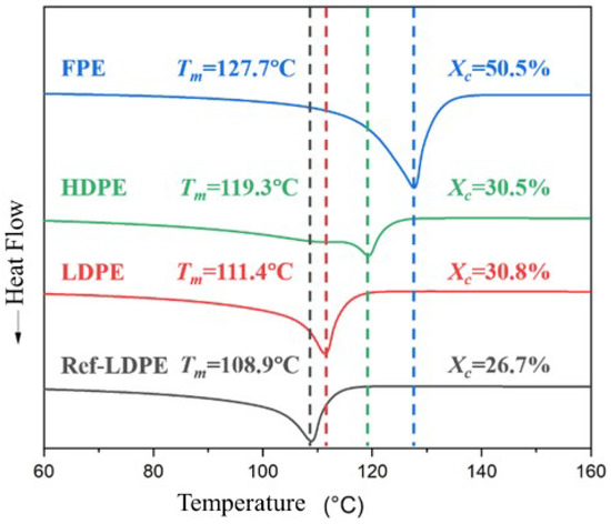 The DSC curves of unaged Ref-LDPE, LDPE, FPE, and HDPE samples in the N2 atmosphere are shown in Figure 2. The melting point of ref-LDPE and LDPE is low, while FPE has the highest melting point of 127.7 °C and crystallinity of 50.5%.
