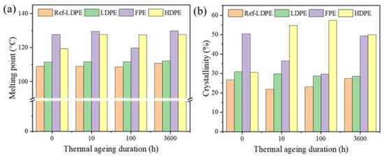 After thermal aging treatment for 10 h, 100 h, and 360 h, various samples’ melting point and crystallinity changed, as shown in Figure 3. The melting point of REF-LDPE and LDPE is lower than FPE and HDPE (see Figure 3a). With the extension of thermal aging duration, the melting point of FPE and HDPE changes more obviously than that of RE-LDPE and LDPE. Notably, the melting points of HDPE after a thermal aging increase by ~7% more than that of the unaged samples.