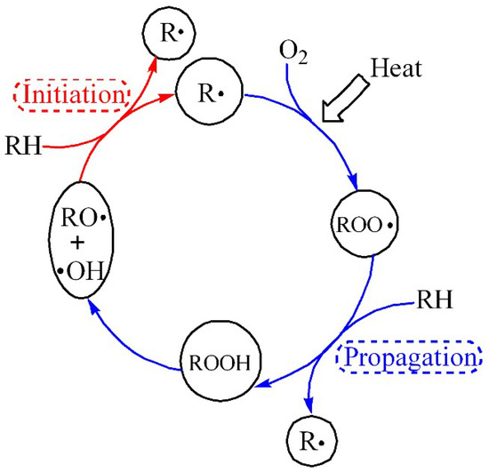 During regular service, the cable will inevitably contact the air, and the polymer insulation material will combine with O2 molecules to form oxygen-containing groups, which will lead to thermal oxidation degradation. The polymer’s electrical, mechanical, and thermal properties will decline to different degrees, affecting the regular use of the cables. Figure 4 shows the initiation and propagation of thermal oxidation (RH represents PE chains) under the high temperature and O2 atmosphere. The oxidative degradation process of PE materials is a chain reaction process, which includes chain initiation of primary free radicals, chain growth of oxidized products, and chain termination of free radicals.
