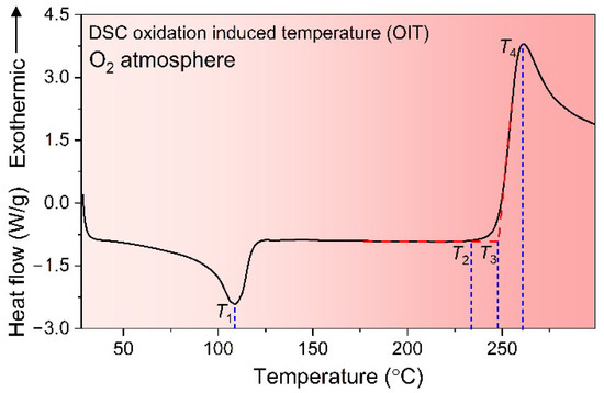 Schematic diagram of OIT curve of XLPE material based on the DSC technique.