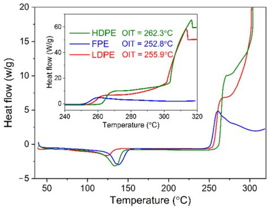 Figure 6 shows the OIT curves of three PE materials, illustrating the heat flow at high temperatures. According to the above, there is a difference in OIT between three PE materials, i.e., HDPE is the highest and FPE is the smallest, with a gap of ~10 °C. Notably, the FPE material oxidizes at 252.8 °C and reached its first oxidation peak at ~260 °C. However, the subsequent heat flow of the oxidation reaction showed a continuous downward trend, with no second prominent exothermic peak before 320 °C, as seen in HDPE and LDPE groups (see the illustration in Figure 6). This means that a second oxidative exothermic peak in FPE should occur at temperatures above 320 °C, pending further validation by subsequent TGA measurements. Figure 6 also shows the absorption peaks of the melting process of three PE materials at 100–150 °C, consistent with DSC test results in the N2 atmosphere.