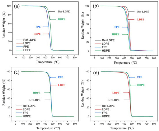 Figure 7 shows that the TGA curves of all PE materials are relatively similar, corresponding to the fastest decomposition (fastest mass decline), indicating the similar thermal stability of molecular chains. In addition, there is only one stage of weight loss in the TGA curve of each PE material, meaning that there is only one principal component.