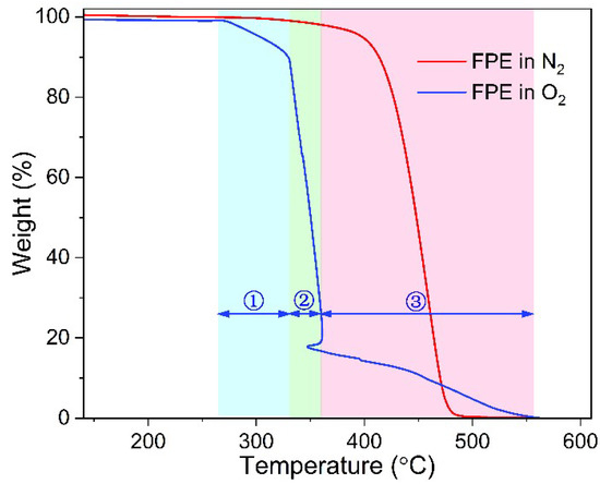 Figure 8 compares the effects of N2 and O2 on the decomposition curves of FPE material via TGA measurements. The weight loss curve of FPE can be divided into three stages under the O2 atmosphere. The first stage is 270–330 °C with a weight loss of 10% due to the thermal-oxidation aging, and the second stage is 330–360 °C with a weight loss of 73% due to C−C molecular chain pyrolysis. The third stage is 360–560 °C, with a weight loss of 17% due to the C−O groups. In contrast, FPE material has only one weight-loss stage in the N2 atmosphere with a temperature range of 400–480 °C. The thermal weightlessness in the N2 atmosphere is only C−C molecular chain pyrolysis. Therefore, the thermal weight loss in the first stage of FPE under an O2 atmosphere is closely related to the thermal aging process during actual service.
