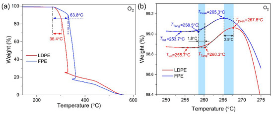 Thermal degradation curves of FPE and LDPE in TGA tests under O2 atmosphere (a) 40–600 °C, (b) 250–275 °C.