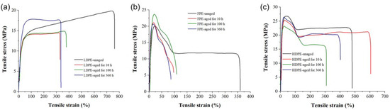 Tensile curves of thermally aged PE samples. (a) LDPE, (b) FPE, and (c) HDPE.