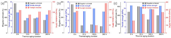 Tensile parameters of thermally aged PE samples. (a) LDPE, (b) FPE, and (c) HDPE.