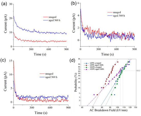 Figure 12 shows the electrical conduction current and AC BDS results of thermally aged PE materials. Conduction current measurements were performed with a 10 kV/mm electric field. The steady-state current was smaller than 5 pA for unaged LDPE material, but larger than 10 pA after thermal aging, as shown in Figure 12a. As can be seen from Figure 12b,c, the conduction currents of FPE and HDPE materials do not change significantly after thermal aging, and the steady-state currents are both lower than 2 pA. Among the three PE materials, aged LDPE material has the most considerable conduction current, suggesting that thermal oxidation aging has the most significant effect on the internal microstructure of LDPE material, introducing more shallow traps, providing more channels for carrier transport, and thus increasing electric conductivity. Further, the AC BDS of aged LDPE material decreased significantly by 15% in Figure 12d, while that of HDPE material only decreased by 4%.