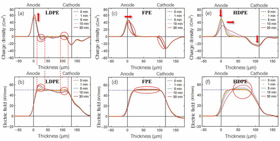 FPE material showed a small charge injection and migration to the bulk of the sample in both cathode and anode regions, as shown by the arrows and circles in Figure 13c. A slight distortion of the electric field in the bulk area is shown in Figure 13d. In Figure 13e, the space charge distribution of HDPE material shows that the negative charge density peak has a different shape than the right peak at the initial polarization stage. The charge in the anode region is injected and migrated inwards with the polarization, and some charge accumulates near the cathode. As can be seen from Figure 13f, the space charge behavior above also leads to a significant electric field distortion.