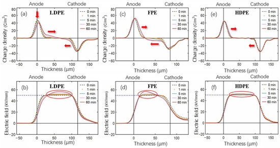 (a,c,e) Space charge and (b,d,f) electric field distribution of single-layer 360 h aged LDPE, FPE, and HDPE samples polarized for 60 min under −50 kV/mm, respectively.