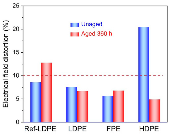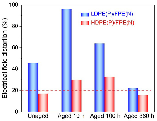 From the electric field distortion, the maximum electric field of LDPE(P)/FPE(N) is −72.7 kV/mm, and the distortion rate is 45.5%. The maximum electric field of HDPE(P)/FPE(N) is −58.5 kV/mm, and the distortion rate is 17%. Furthermore, considering the influence of thermal aging, the electric field distortion is aggravated at the initial aging stage. Still, with the extension of thermal aging, the change of the internal microstructure tends to be stable. In contrast, the electric field distortion rate gradually decreases as shown in Figure 17.