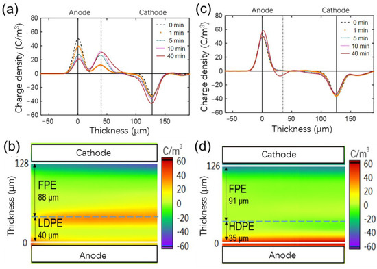 Space charge distribution of unaged (a,b) LDPE(P)/FPE(N) and (c,d) HDPE(P)/FPE(N) polarized for 40 min under −50 kV/mm.