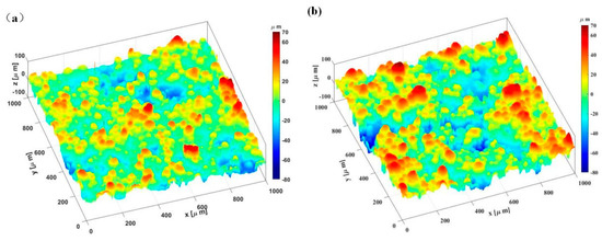 The surface topography of the PA12 and SiC/PA12 composites are shown in Figure 1. These surfaces look like “Greenwood and Williamson” surfaces [37], which have been investigated by numerous researchers [38,39,40]. They also look like hemispheres arranged on the surfaces that have been widely studied [41,42,43], most of which considered metallic materials. Different from the regular rough surfaces processed by traditional methods, numerous powders are arranged in a random array on the rough surface processed by selective laser sintering (SLS). As can be seen from Figure 1b, these two materials showed similar roughness trend, and the SiC/PA12 composites showed a higher roughness than that of PA12. The calculated Root Mean Square (RMS) increased by about 49%. The displayed asperities are nearly spherical. Generally, spherical powders are of good flowability and therefore are conducive to obtaining smooth layers and higher packing densities.