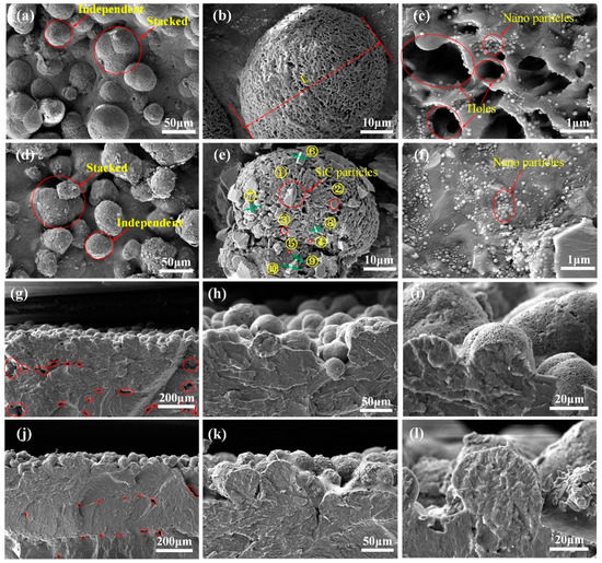 Figure 2 shows the surface and cross-sectional scanning electron microscopy (SEM) images of the PA12 and SiC/PA12 composites with different magnifications. These images confirmed the microstructure of all the specimens shown in Figure 1. The particles on the surface emerged aggregation phenomenon in local regions to form asperities. PA12 powders showed near-spherical morphologies, with the diameters about 10–30 distributed on the surface of PA12 and SiC/PA12 composites in the form of superposition or independence (Figure 2a,d). Figure 2b,e shows the high magnification images of the red square area in Figure 2a,d. The size of PA12 powder is also measured, as shown in Figure 2b, and the length of the single powder in the figure is about 49.4 μm. The SiC particles at different locations are numbered from 1 to 10 in Figure 2e. From Number 1 to number 5, the diameters are measured, the maximum diameter is 7.25 μm, and the minimum one is 0.6 μm. From Number 6 to number 10, the thickness was estimated. It has a little change, the average value is 0.82 μm, and the RMS error is 0.27 μm. Numerous micropores are connected to the surface of PA12 powders, the surfaces of which are adhered to numbers of SiC particles for SiC/PA12 composites. The SEM micrographs of PA12 and SiC/PA12 composite with a larger magnification are depicted in Figure 2c,f. Numerous nano-particles are adhered to the holes of asperities surface of PA12 and SiC/PA12 composites. Nano-particles are added to power particles to adjust powder melting and forming characteristics. Figure 2g–l shows that the fractured surfaces of PA12 and SiC/PA12 composites are compact and smooth. It seems that the additions of SiC particles can achieve more effective densification in the PA12 matrix. As can be seen from Figure 2g,j, the cross section of SiC/PA12 composite is fully dense, and only a few pores exist. It indicated that the addition of SiC particles reduced the size and number of pores and increased the densification of the printed specimen.