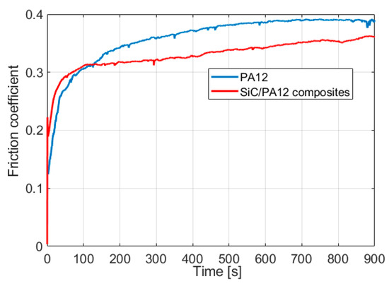 The friction coefficient of PA12 and SiC/PA12 composites are shown in Figure 5. The friction process can be divided into two stages. In the first stage, the friction coefficient of both samples increases dramatically for about 120 s. The friction coefficient of SiC/PA12 is lower than that of PA12. Then, the friction coefficients enter into the second stage and display a slow increase to a steady state. It is observed that the friction coefficient of SiC/PA12 composites is less than that of PA12 around 10%.