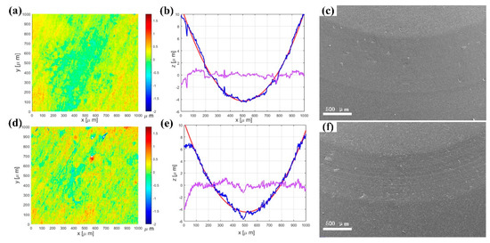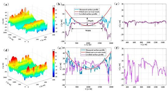 Figure 7 shows the worn three−dimensional topographies and fitted curves of wear tracks of PA12 and SiC/PA12 composite. The 3D topographies of the wear tracks of PA12 and PA12/SiC composite after the sliding wear tests are shown in Figure 5. The wear tracks on the surface of PA12 and SiC/PA12 composites sample are different. As shown in Figure 7a,d, the wear track of the PA12 is smoother and deeper than that of the SiC/PA12 composites. Two-line profiles of the 3D surfaces are selected to further obtain the fitted curve at wear tracks (Figure 7b,e). Levelled surface profile was obtained by measuring the surface profile minus the fitted curve, as shown in Figure 6. The results clearly show that the wear tracks surface of SiC/PA12 composite are much rougher than that of PA12. In addition, the surface roughness both inside and outside of wear tracks increases due to the addition of SiC particles.