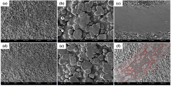 In order to understand the wear mechanisms of each sample, the morphologies of the wear tracks after a dry sliding wear test were observed and the results are given in Figure 8. After more than 5000 sliding cycles, no microcracks were observed on the worn surfaces of these specimens, suggesting their resistance to plastic deformation. Only a few asperities are in contact and deformed at the initial stage. Meanwhile, a narrow wear track was observed, as shown in Figure 8a,d. Figure 8b,e shows microstructures with a high magnification of the area, and the deformation depends on the height distribution of the asperities. After the process of sliding, the depths and widths become larger due to the combination of the normal and tangential loading. The parallel grooves and scratches along the sliding direction and layer-shaped cracks resulted from abrasive wear, as seen in Figure 8c,f. It suggested that the combined abrasive and fatigue wear is dominant in the wear tests of all samples. As can be seen from Figure 8c,f, there are some deformed asperities on the wear tracks of SiC/PA12 composites surface, while the wear track of PA12 is much smoother. Compared with the cases of the PA12, the number of wear grooves is larger due to the presence of worn SiC particles during sliding. The width of the wear track of SiC/PA12 composites is smaller than that of PA12. Therefore, SiC addition improves the wear resistance of the PA matrix due to the hardness improvement, which is consistent with the results of the friction coefficient and specific wear rate as given in Figure 5 and Figure 6.