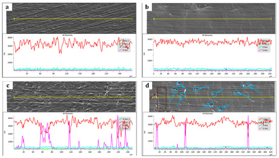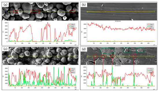 The SEM images and corresponding line scanning EDS analysis. (a) Outside of wear tracks for Pure PA 12 specimens. (b) Inside of wear tracks for Pure PA 12 specimens. (c) Outside of wear tracks for SiC/PA12 composite specimens. (d) Inside of wear tracks for SiC/PA12 composite specimens.