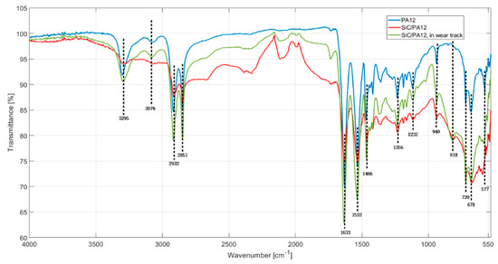 FTIR test is carried out to investigate the chemical components’ inside and outside wear tracks of the PA12 sample and SiC/PA12 composite. The FTIR absorption spectra of the three samples are shown in Figure 10. The blue line, red line, and green line represent the FTIR absorption spectra of PA12, outside and inside of SiC/PA12 composite, respectively. For the PA12 sample, the peaks at 3295 cm−1, 3076 cm−1, and 1533 cm−1 are the stretching vibration adsorption of N-H, the moderate amide B bond, and amide II band (C-N stretching vibration plus CO-NH bending), respectively. The peak at 678 cm−1 is the amide V band (N-H out-of-plane bending), and the peak at 577 cm−1 is the amide VI band (C-O out-of-plane bending). There are distinct peaks at 2932 cm−1, 2851 cm−1, and 1633 cm−1, corresponding to asymmetric stretching vibration of CH2, symmetric stretching vibration of CH2, and the stretching vibration of amide C-O, respectively. For the SiC/PA12 sample, in the spectrum of the outside of the wear track, in addition to the functional peaks for the PA12 sample, one more apparent peak appears at the wavenumber of 820 cm−1, indicating that a variety of Si-C groups are formed in the sample. However, the characteristic peaks also have some deviation. The amide VI band at 577 cm−1 shifts to 592 cm−1. The amplitude and width of the moderate amide B bond also have obvious changes. In the spectrum of the outside of the wear track, the results are similar to the one obtained from the outside, which suggests that the integrated structure of the inside case sample is still consisting of SiC particles. The amplitudes of the peak where the wavenumbers are 2932 cm−1, 2851 cm−1, 1633 cm−1, and 1533 cm−1 increase significantly, indicating that the absorption capability becomes stronger.