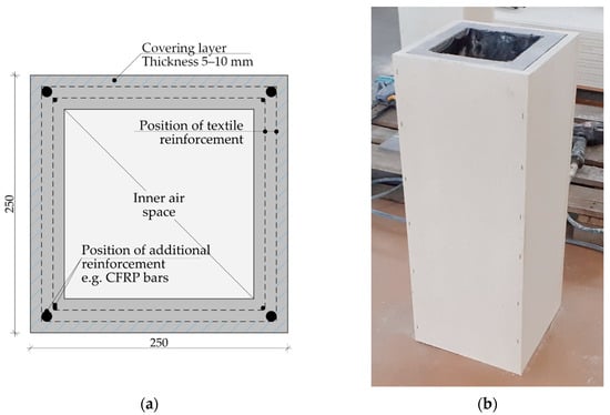 Scheme of the TRC beam structure (column) with hollow section 250 mm × 250 mm: (a) theoretical scheme of the column with additional CFRP bars reinforcement; (b) developed pattern of the TRC column with two layers of textile reinforcement and CFRP tensions bars covered by fire protection board system.