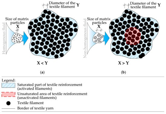 Scheme of tensile reinforcement saturation: (a) textile reinforcement penetrated by material with a homogenous structure such as epoxy resin—full activation of yarns is achieved; (b) textile reinforcement penetrated by suspension with particles larger than the filaments of the yarn—central part of yarn is not activated.