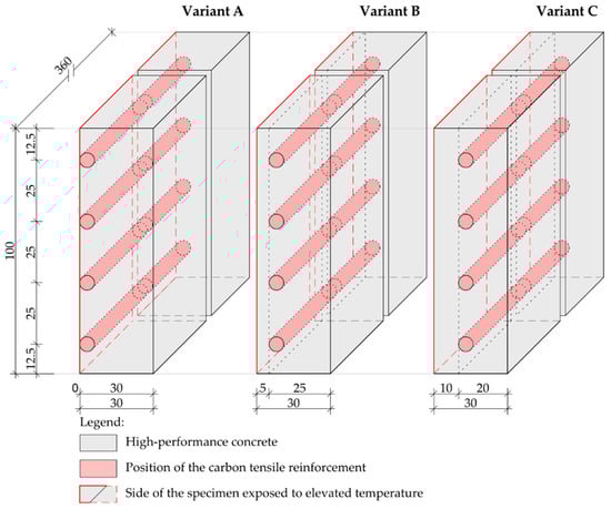 Scheme of the test plate specimens and position of the tensile reinforcement Legend: Variant A—plate specimens with 0 mm covering layer used for direct exposure of textile reinforcement to fire Variant B—5 mm covering layer as minimum possible covering layer regarding the interaction between the materials Variant C—standard 10 mm covering layer of TRC structures.
