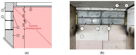 Scheme of the position of the test specimens: (a) side view on the specimen placements; (b) view from inside the furnace of the placed test specimens Legend: 1—exposed side of the test specimen; 2—steel construction holding test specimens; 3—furnace front wall from aerated concrete blocks thickness 100 mm; 4—ceiling of the furnace.