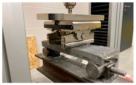 The bending strength of the reference plate specimens and residual bending strength of specimens exposed to elevated temperature was determined by a four-point bending test (Figure 5). The maximal applied force was measured during the mechanical test before the rupture, or when massive deformation of samples has occurred. The force applied during the mechanical test was transferred through a steel element with three degrees of freedom to eliminate geometric imperfections in the test body and to ensure uniform loading. The distance between the steel cylinders of mechanical press was 100 mm. The velocity of applied force was set at 2 mm·min−1. The entire mechanical test was carried out according to EN 12390-5.