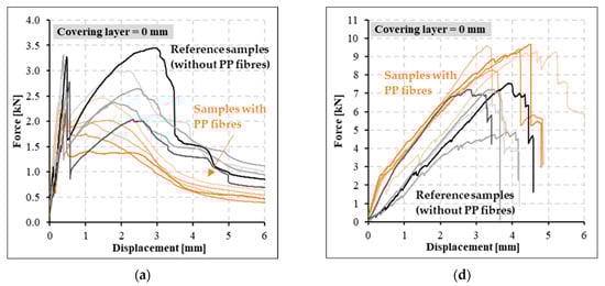 Bending strength of reference specimens with cement suspension matrix (a–c) and epoxy resin matrix (d–f) for different thickness of the covering layer.