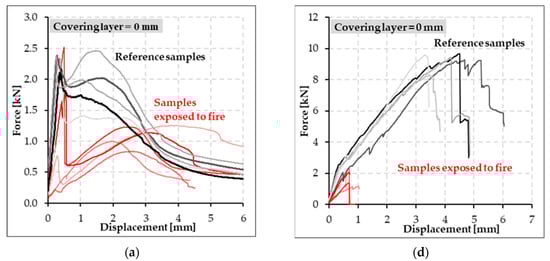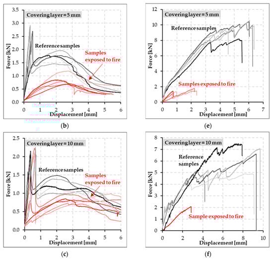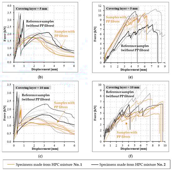 Comparison of the resulting residual strength of the test plate specimens after the fire test with reference specimens: (a–c) test plate specimens with cement suspension matrix; (d–f) test plate specimens with epoxy resin textile reinforcement matrix Note: All specimens mentioned in Figure 11 were made according to Table 4 from the HPC mixture No. 1.