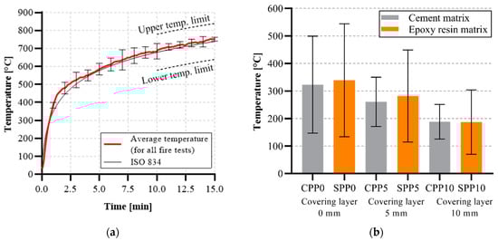 Measured temperature from the test furnace and tested specimens: (a) average temperature curve in the test furnace; (b) measured average temperatures of the specimens on the inner surface of the textile reinforcement for different covering layers and concrete mixture variants.