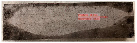 Test specimen with 10 mm covering layer and an addition of PP fibers in concrete mixture (HPC mixture No. 1)—the development of a transverse crack during a fire test.