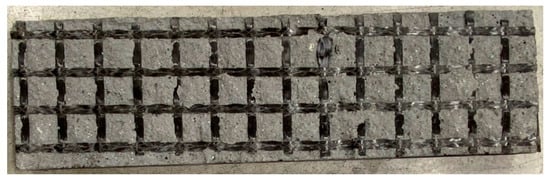 Two different variants of textile reinforcement were used. The first variant contained a prefabricated carbon grid saturated by an epoxy resin matrix. This commercial product is available as Q85/85-CCE-21 from the Solidian company. The second variant of specimens used carbon rovings Tenax® E HTS 40. The second variant of reinforcement was subsequently impregnated with a cement suspension. The suspension was prepared from cement CEM 52.5 R according to [32] with water with a ratio of 1:2. Several rollers mechanically pressed and pulped the carbon yarn, which enabled deeper penetration of the cement suspension. Related mechanical properties of the textile reinforcement were drawn from the technical sheets of products and described in Table 3.