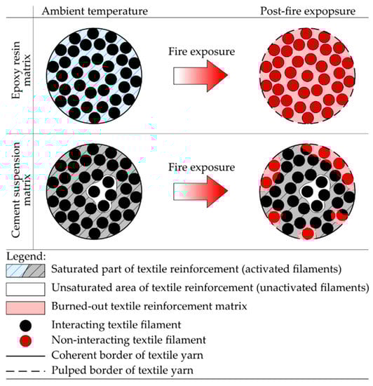 Schematic description of the fire exposure influence to a different type of textile reinforcement matrix.