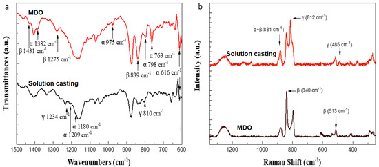 - Cai, X.; Lei, T.; Sun, D.; Lin, L. A critical analysis of the α, β and γ phases in poly (vinylidene fluoride) using FTIR. RSC Adv. 2017, 7, 15382–15389. [Google Scholar] [CrossRef] [Green Version]
